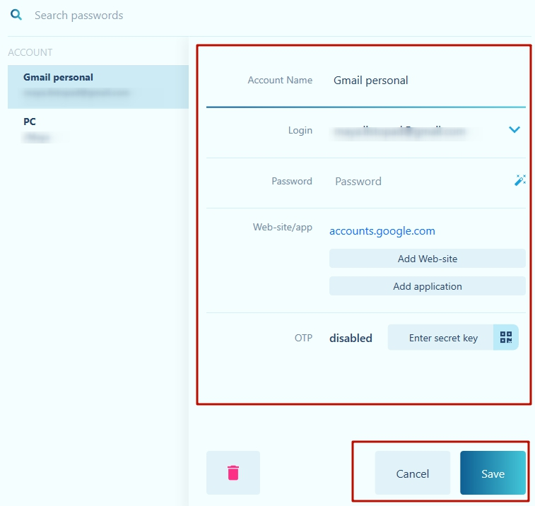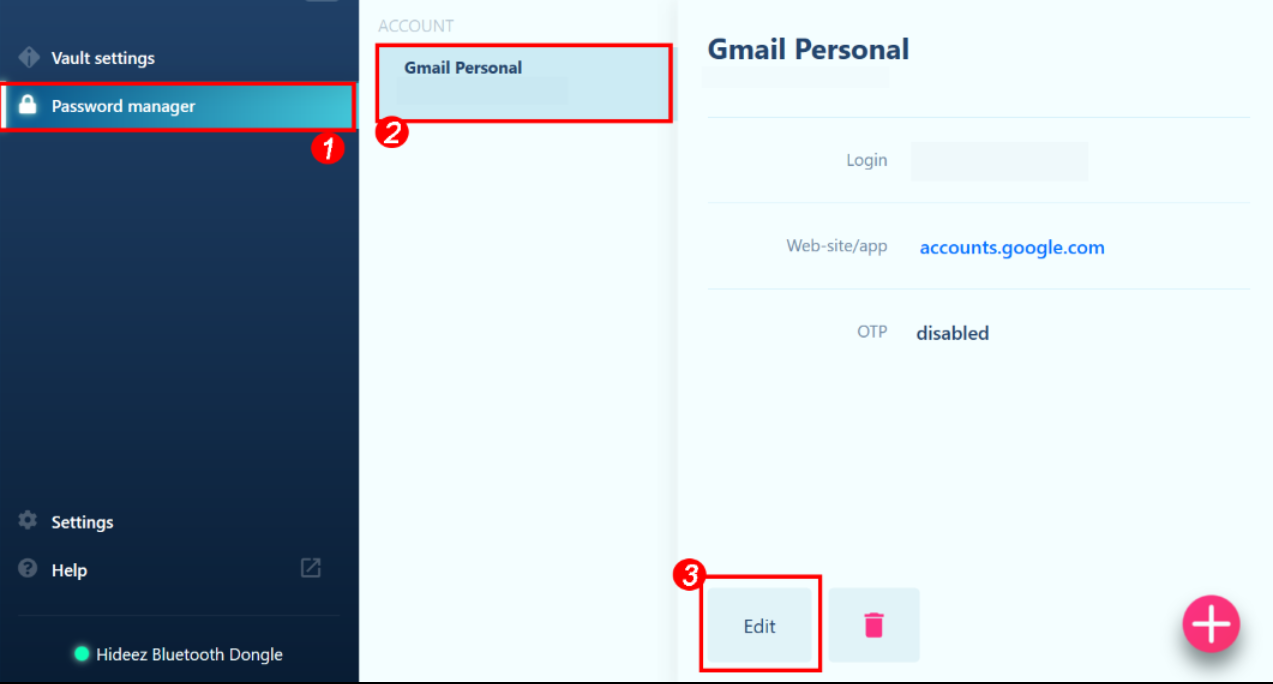 In the Password manager section, double-click the account line to open the detailed information. Click Edit and go to the account data editing window.