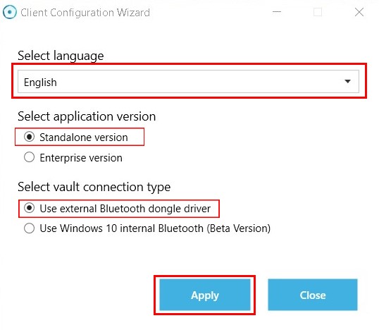 Run the clientsetup.exe file, select the Standalone version and check the Use external Bluetooth Dongle box. In addition, you can choose the language required. Choose desired options and click the "Apply" button.
