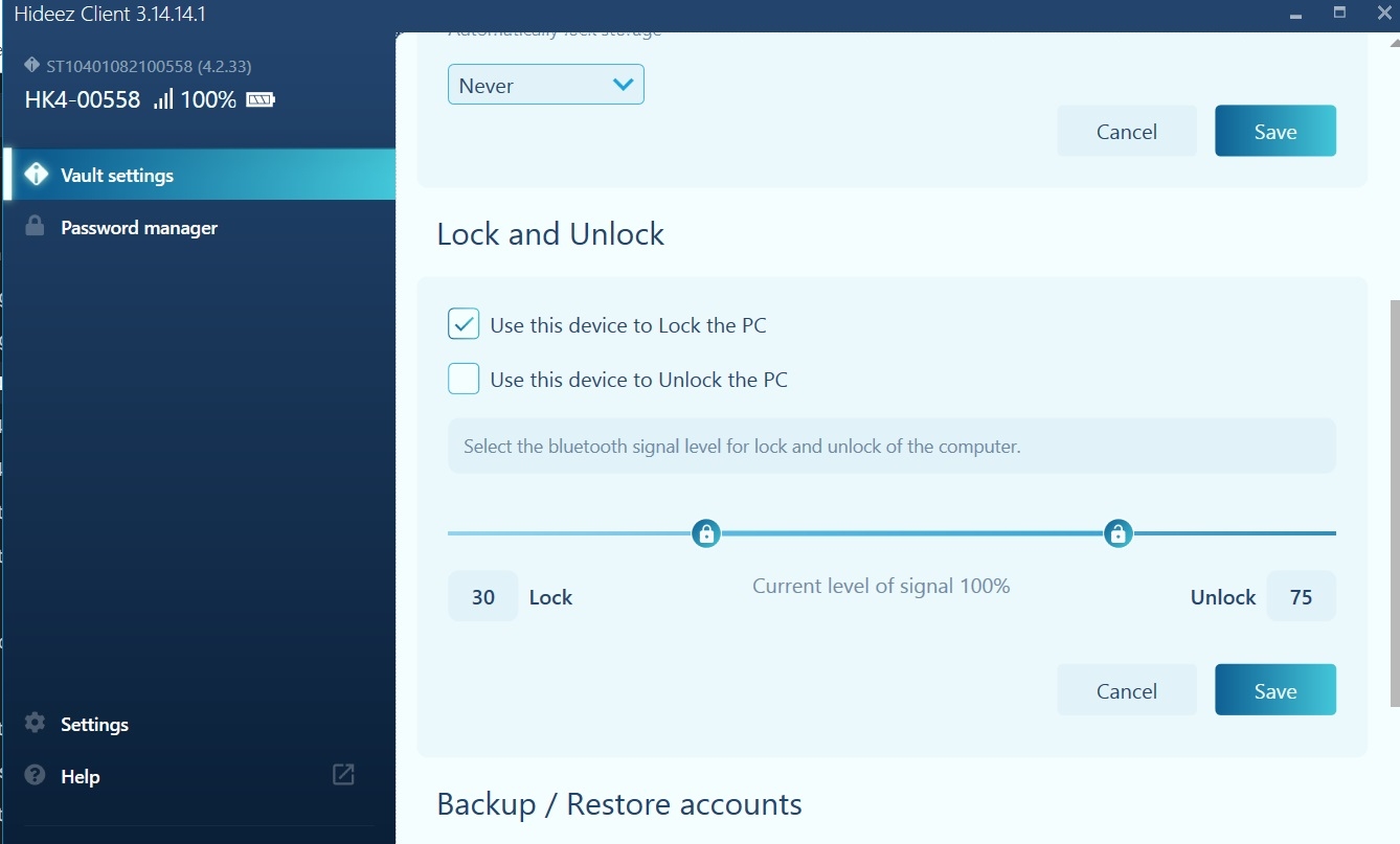 To automatically lock your computer when you step away from it, check the "Use this device to lock the PC" box in the Vault settings. You can adjust the distance you need with a slider. Your desktop will be locked when the Bluetooth signal level falls below the specified value in % and unlocked when the Bluetooth signal level exceeds the specified value in %.