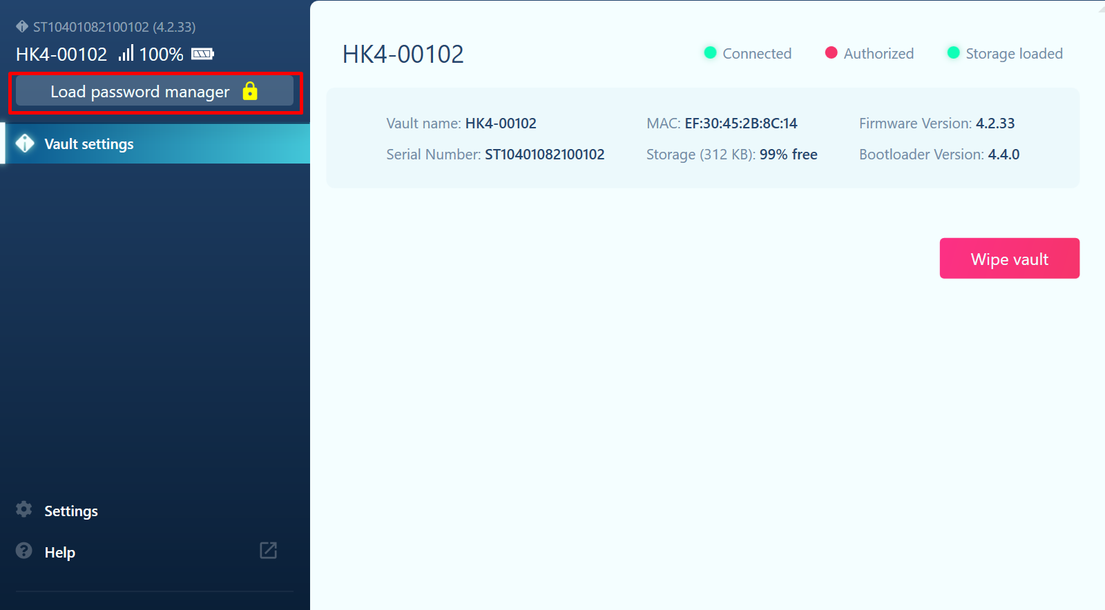 After updating the firmware, click the "Load password manager" button in the upper left corner to access the Password Manager. You will be required to enter the master password you created during the initial setup.