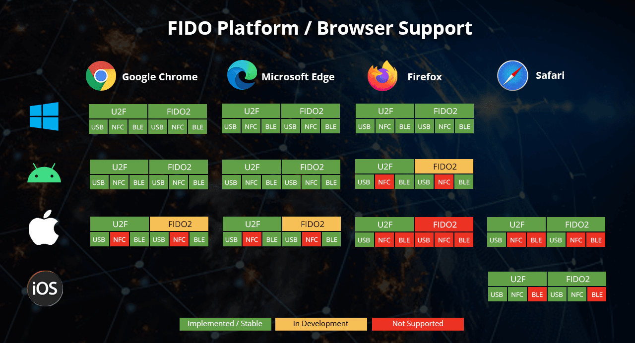Hideez Key supports passwordless authentication standards (FIDO U2F and FIDO2) developed by the FIDO Alliance. FIDO specifications are currently supported by over 300 popular websites and applications in Google Chrome, Mozilla Firefox, Microsoft Edge and Apple Safari web browsers.