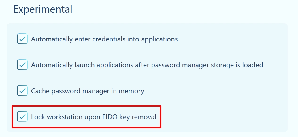 If this checkbox is set, the workstation will be locked after the FIDO key removal from the USB port. ONLY Yubico devices are supported.