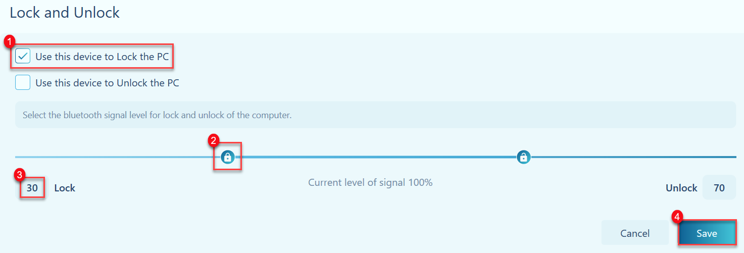 Hideez Key allows you to set up locking and unlocking your PC with the proximity mechanism. Your PC will be locked when the Bluetooth signal level falls below the specified value in % and unlocked when the Bluetooth signal level exceeds the specified value in %.