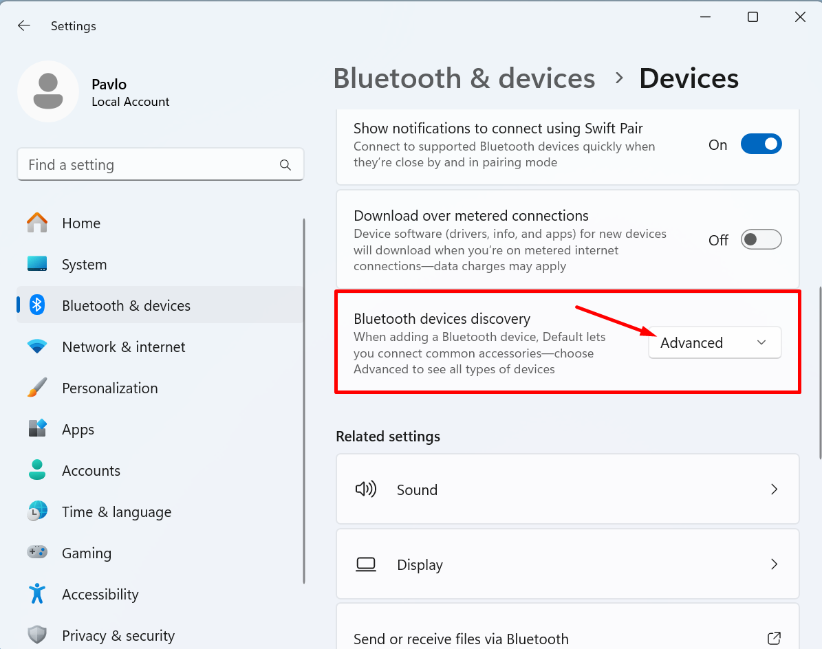 Scroll down to the section Bluetooth devices discovery and select the option Advanced: